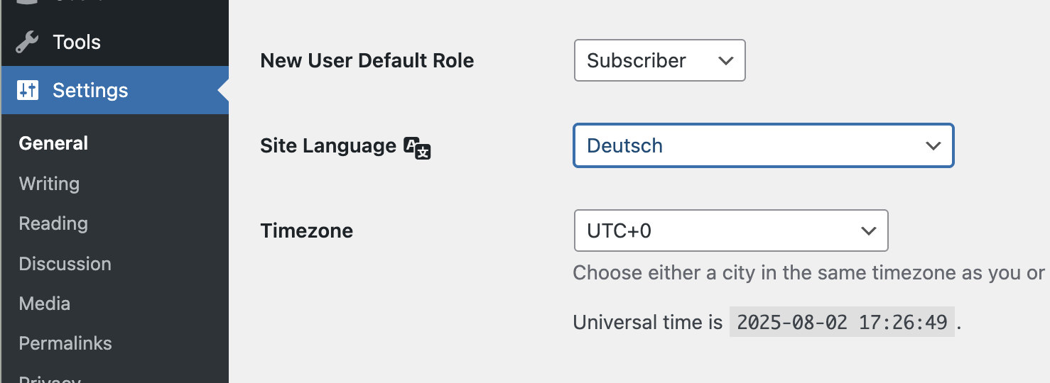 Dafür gehst du links im Menü auf Settings/Einstellungen, Genaral/Allgemein und wählst bei Site Language/Sprache Deutsch aus.